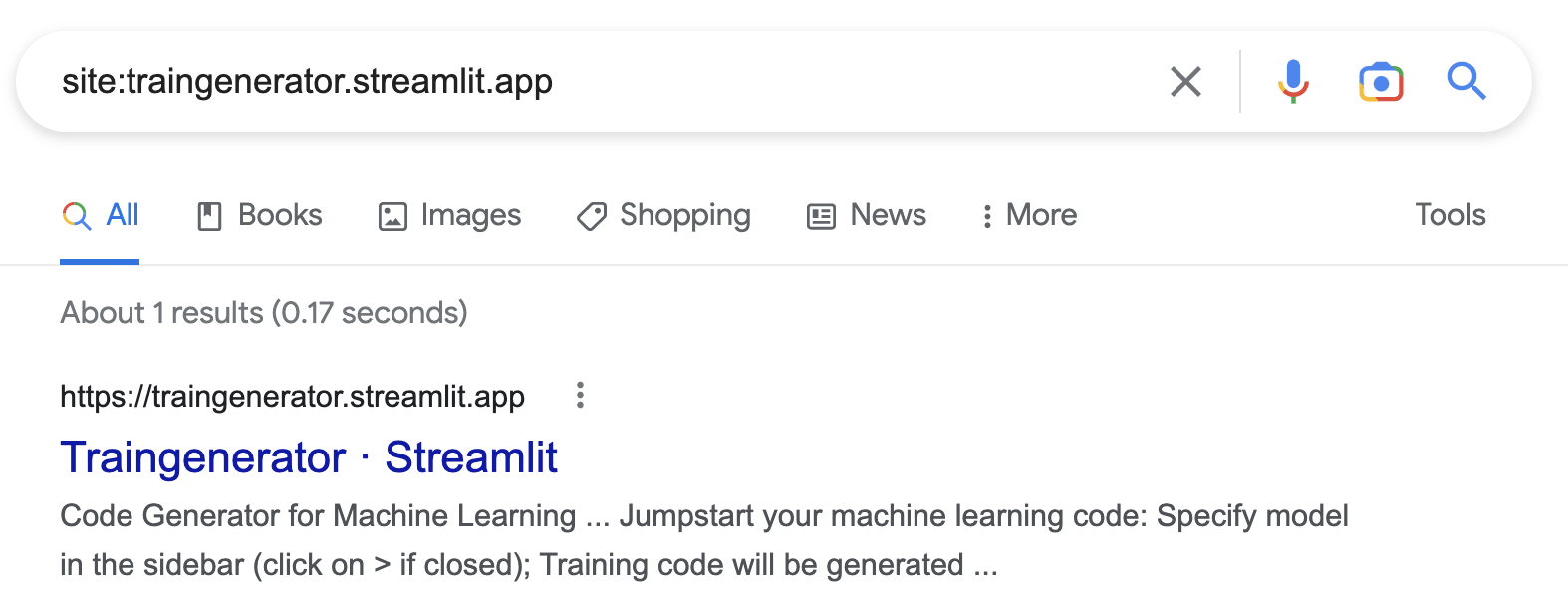 When you deploy a public app to Streamlit Community Cloud, it is automatically indexed by search engines like Google and Bing on a weekly basis. 🎈 This means that anyone can find your app by searching for its custom subdomain (e.g. "traingenerator.streamlit.app") or by searching for the app's title.