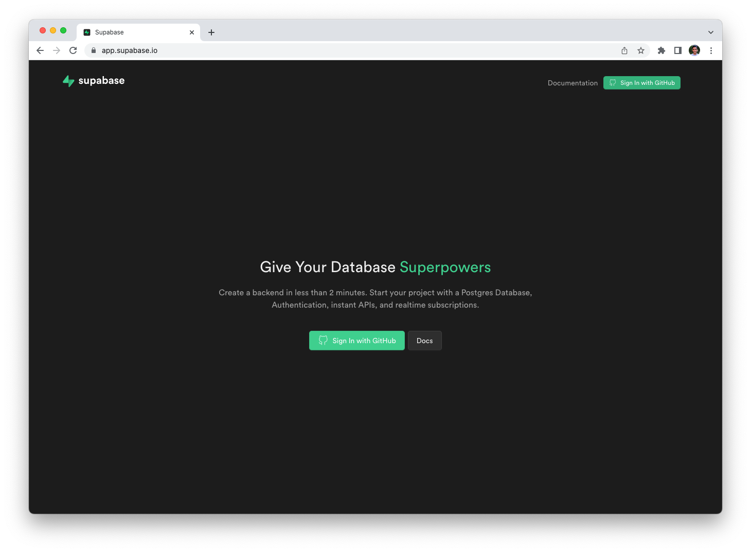First, head over to Supabase and sign up for a free account using your GitHub.